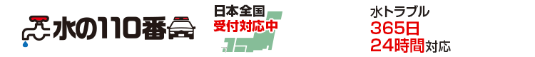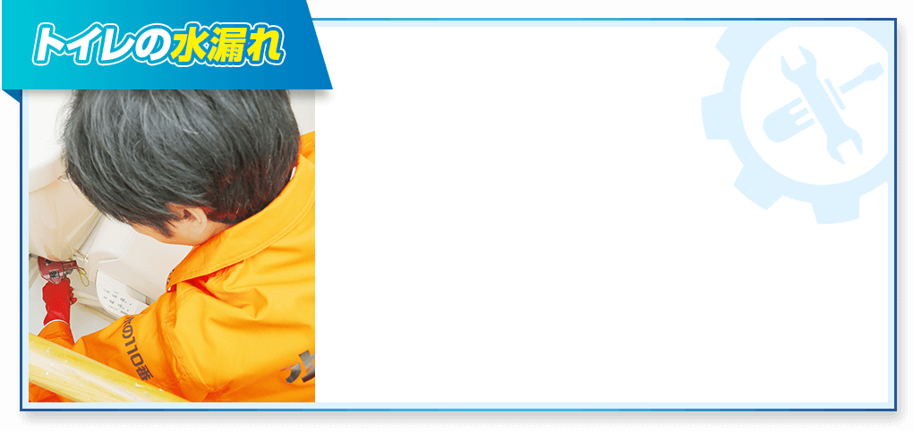 トイレでは給水管、タンク、便器、排水管から水漏れが発生します。もしも、少量でも水が漏れている場所がわかったら直ぐに水の110番までお電話ください。お客様の元へ一番早く伺える認定水道技師をご手配いたします。交換用の部品も作業車に大量に積み込んでいるため、どんなトラブルであってもその日中に修理することができます。