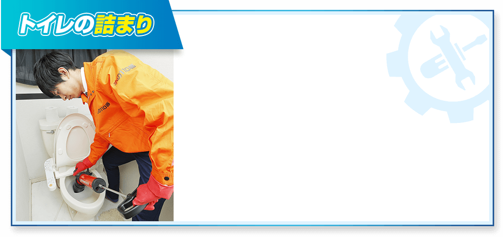 突然起きるトイレ詰まりに水の110番の認定水道技師が駆け付けます。便器から溢れ出てくるような水詰まりであっても、ローポンプやトーラー、高圧洗浄といった特殊機材を使用して即座に解消いたします。